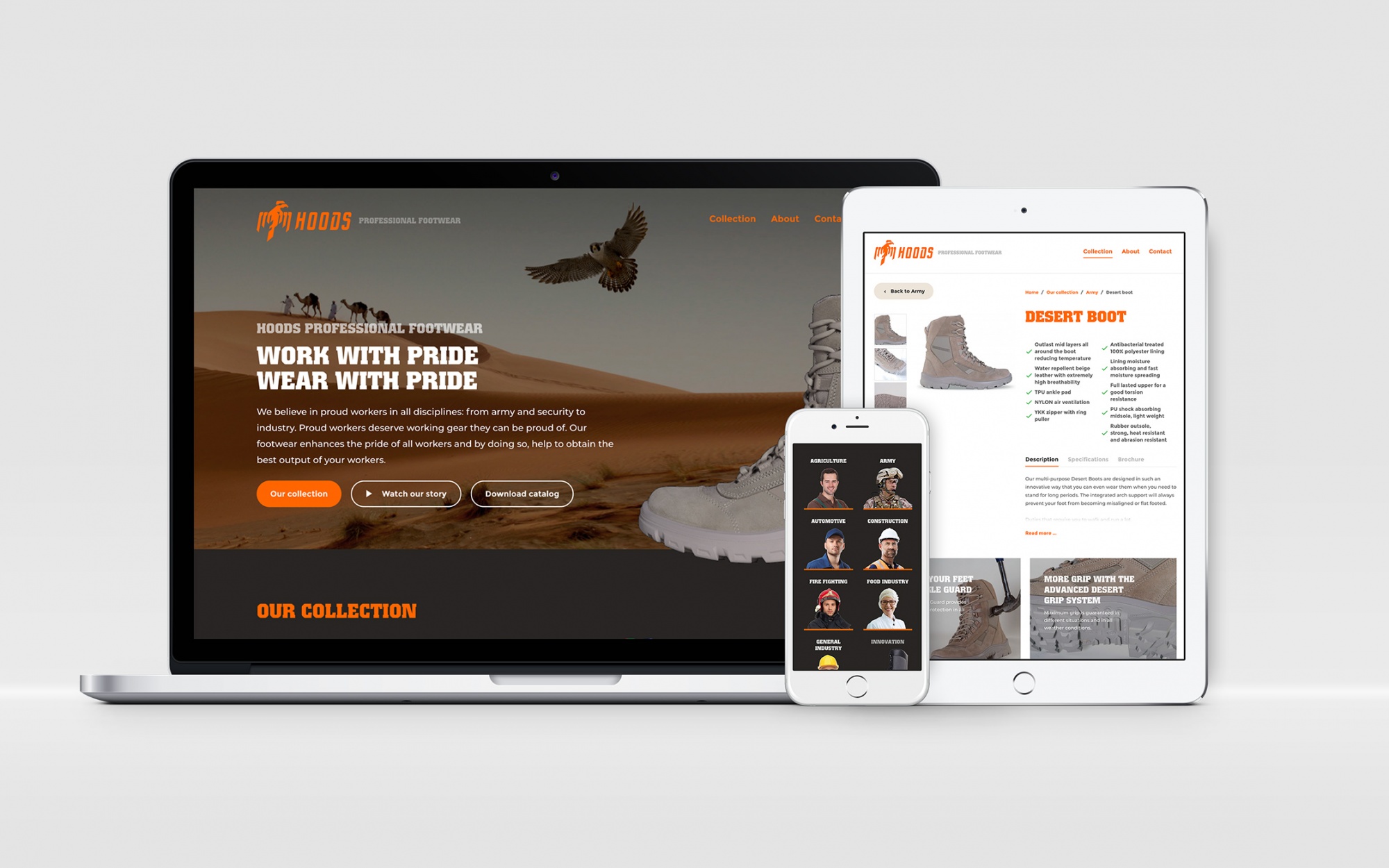 Een zeer bijzonder project dat bij ons is binnengekomen is HOODS. Een samenwerking tussen het meer dan 86 jaar bestaande Emma safety Footwear uit het Nederlandse Limburg én hun partner in Abu Dhabi. Samen ontwikkelden zij een hoge kwaliteit woestijnlaars die geproduceerd wordt in een high tech fabriek in Abu Dhabi.