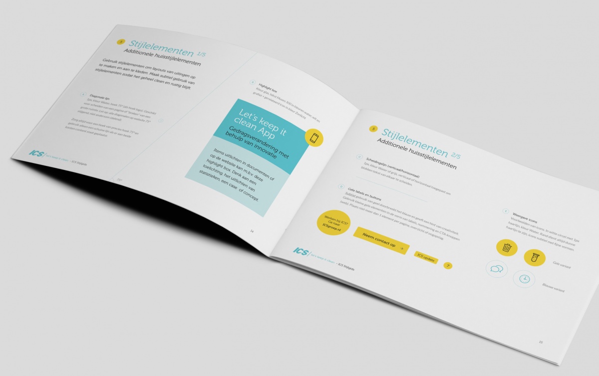 We zijn begonnen met het neerzetten van een sterke, uitgebreid gedefinieerde huisstijl in de vorm van een brandbook. Zo voldoen alle uitingen aan dezelfde kwaliteit en consistentie. Van daaruit konden alle uitingen als drukwerk, website, autobelettering, nieuwe bedrijfskleding en apps worden ontwikkeld. Daarnaast verzorgen we de art direction en kwaliteitsbewaking bij samenwerking met andere leveranciers, zodat ook die uitingen spic 'n span zijn. Inmiddels hebben we 3 apps gelanceerd om de klanten (waaronder NS en Connexxion) van ICS te ondersteunen in het creëren van een schone en veilige omgeving.
